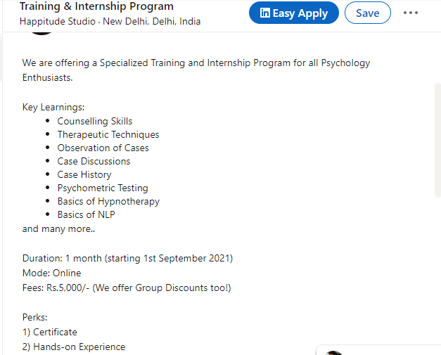These platforms are filled with paid internships, leaving students who want to work with no choice but to pay these pseudo psychologists who are grievously bad at statistics. They promote pseudo-sciences like NLP, Tarot and Astrology. Not only bringing wrong publicity to the profession but deteriorating the next generation of psychologists.